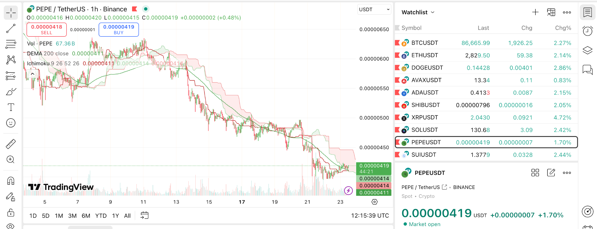 Pepe coin price prediction talk is growing again as PEPE trades at $0.00000419, far below its recent highs. The token is trying to bounce, but the charts still show strong selling pressure. PEPE sits under the MA-20, MA-50, and MA-200, which means the trend is still down across all time frames. The RSI is also at 25, showing deep oversold levels.