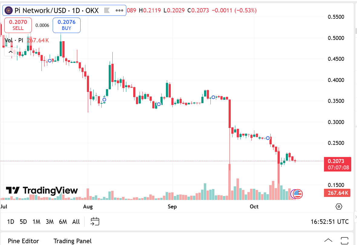 Pi Coin is now valued at $0.2070, 1.25% down in the past 24 hours. Its market capitalization is around $1.74 billion, supported by a 24-hour trading volume of $28.49 million, up 6.99%. That soft increase in volume confirms renewed activity from retail traders and community hobbyists alike.
