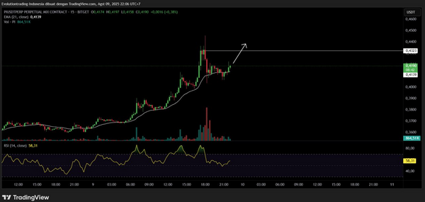 Pi Network has surged 16% intraday, breaking above a resistance channel with a 150% spike in volume. The move pushed the price above the 20-day EMA around $0.404, with resistance at $0.445–$0.46 now the next target.