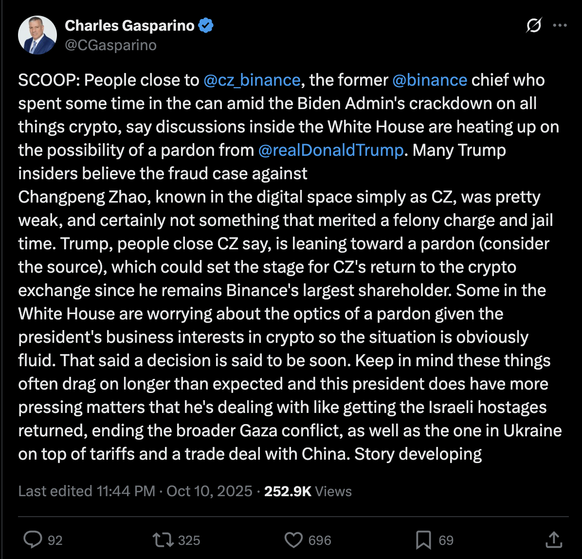 According to Fox Business correspondent Charles Gasparino, sources close to CZ claim that the Trump administration is “leaning toward a pardon”, potentially paving the way for Zhao’s return to a leadership role at Binance.