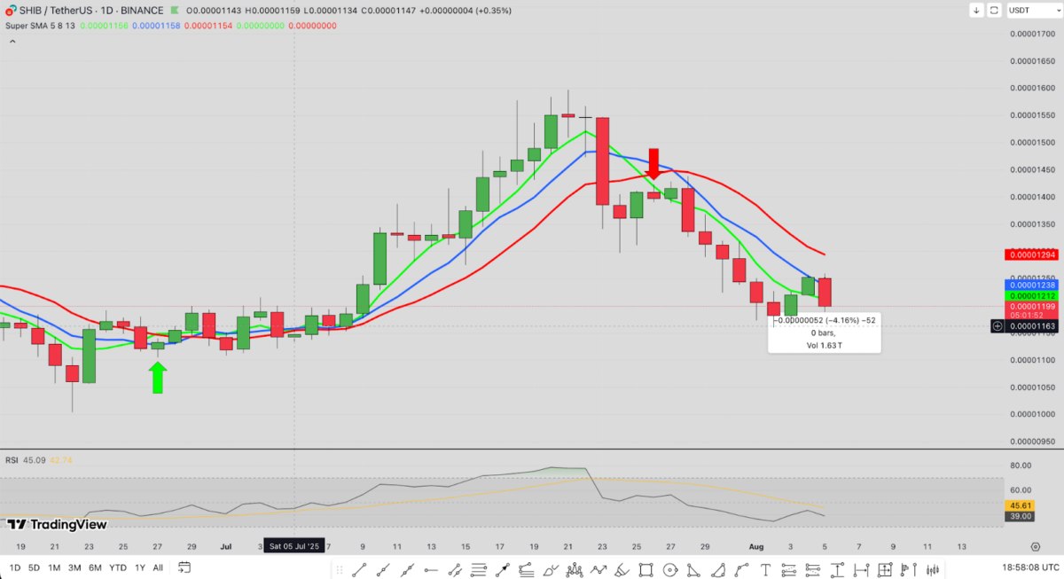 The super moving averages, which include 5, 8, and 13, now signal mixed momentum. The 5 and 8-day SMAs at $0.00001212 and $0.00001238 seem to have flipped the 13-day SMA at $0.00001294.