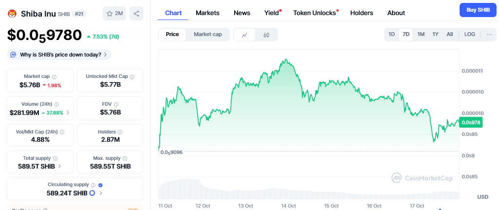 As of October 17, SHIB was trading at $0.000009658 following a 19.8% fall over the past week. The 30-day SHIB price chart also shows a 25.94% fall.