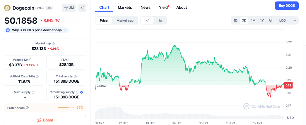 As of October 17, Dogecoin’s value stands at $0.182 following a 31.22% dip over the past month. The 7-day Dogecoin price chart also shows a 24% drop.
