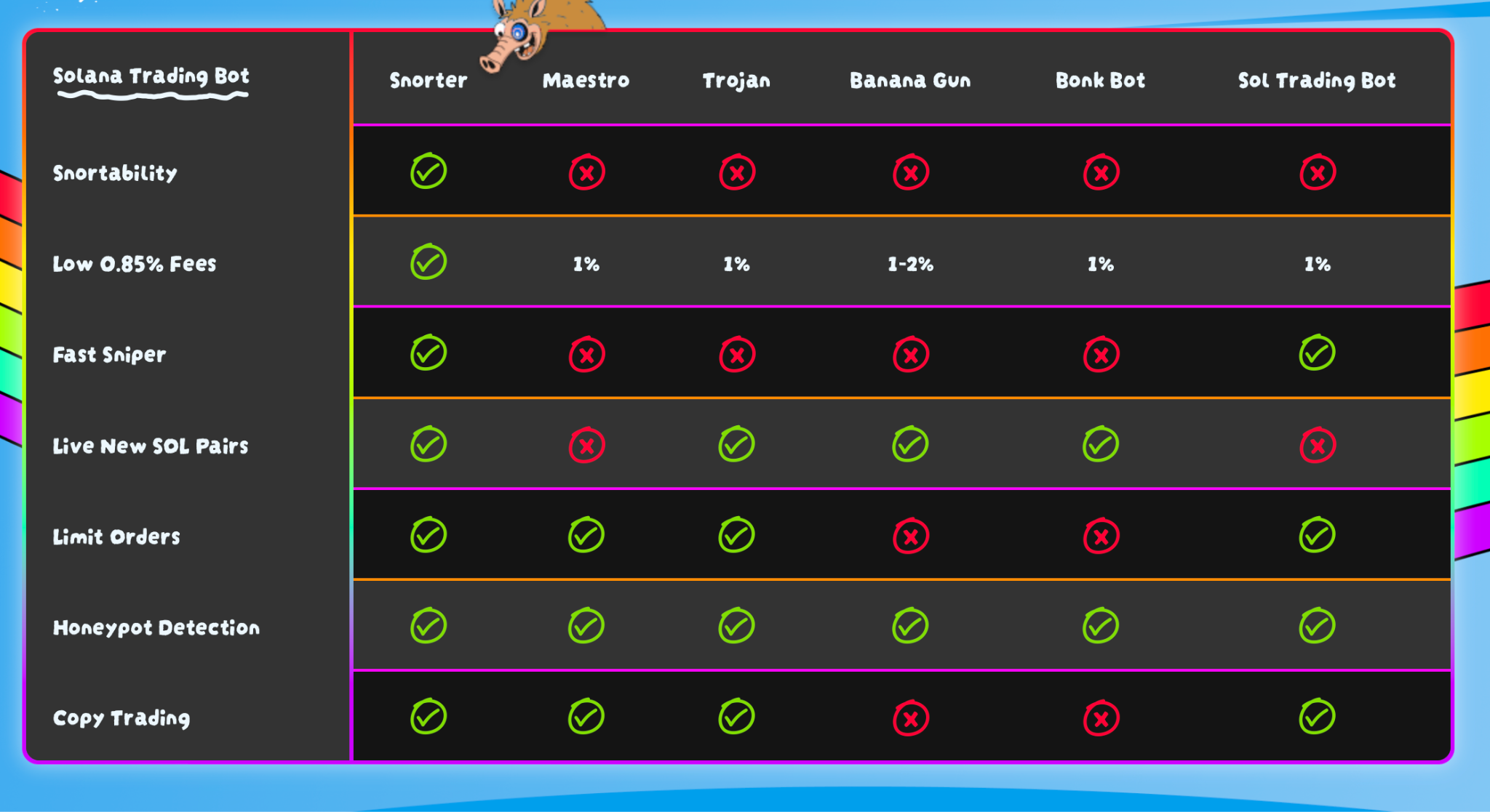 Using Snorter is fast, secure, and cost-effective. It boasts market-leading fees at just 0.85%. That beats alternatives such as Bonk Bot, Maestro, Trojan, Banana Gun, and the rest.