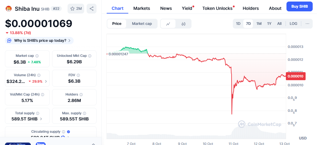 The Shiba Inu coin, like the entire crypto market, nosedived last week. It dropped from $0.000012 to adding another zero on October 10. While there has been a rebound to $0.000010, the dog-themed crypto remains down by 13% on its weekly chart.