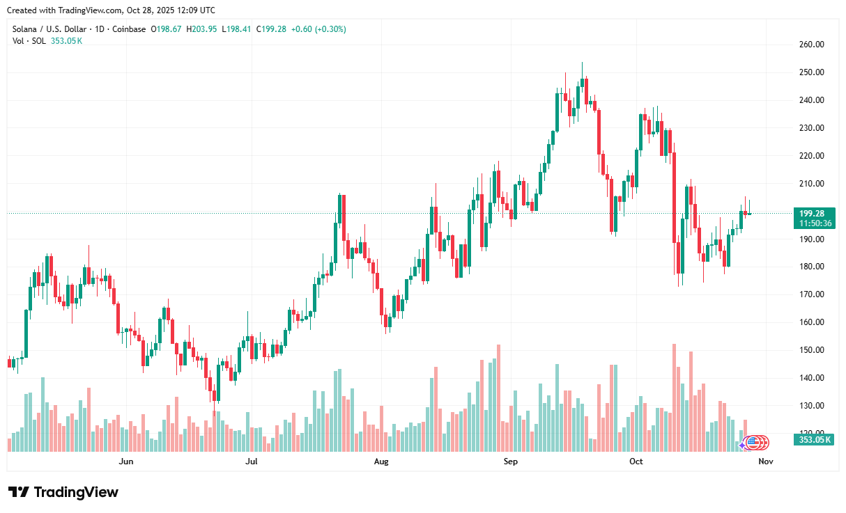 | Solana (SOL) | ~$199 (current) | ETF inflows ≈ $6 B projected | $300+ potential | Institutional growth and high-speed transactions |