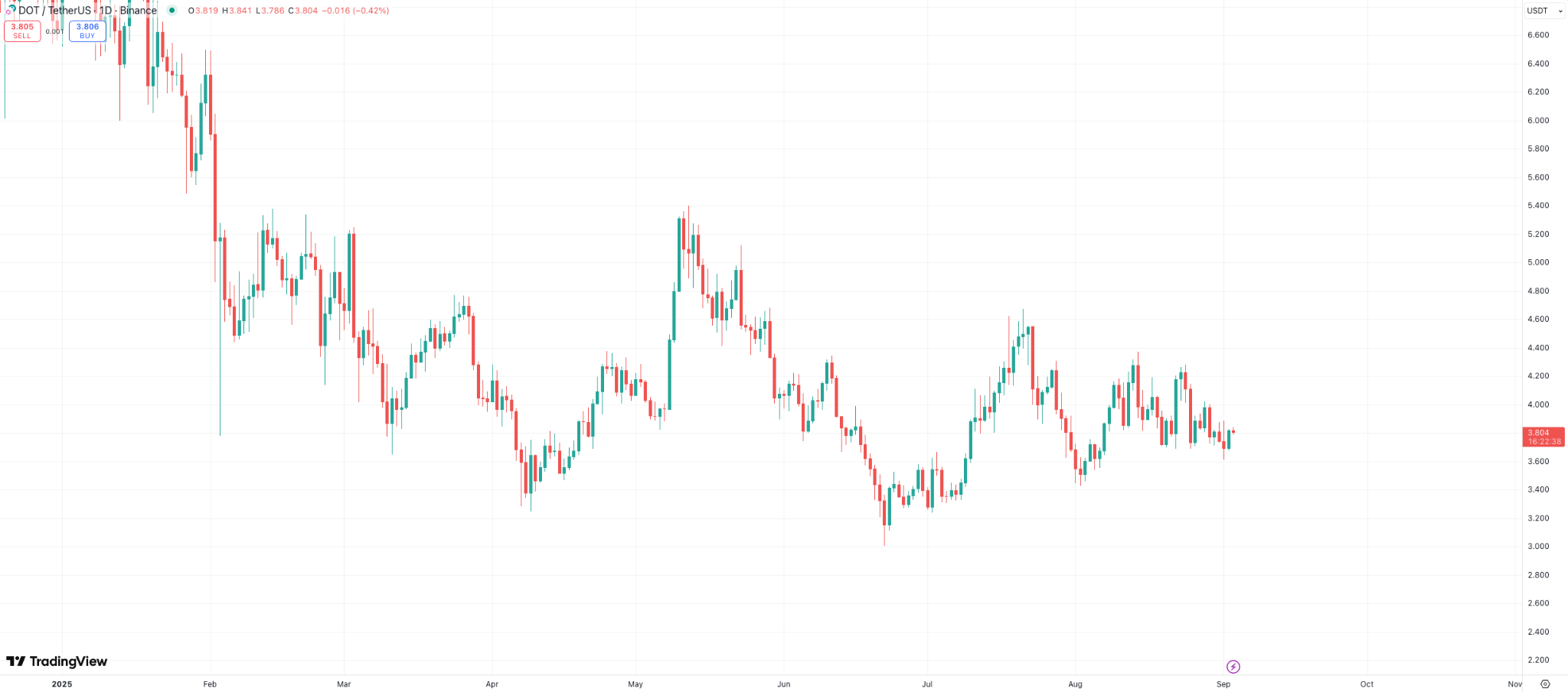 Polkadot has been rangebound, with DOT trading at $3.80 and down about 1% over the past week. Price has moved sideways since early August, but the catalyst lineup for September looks more interesting than the technicals suggest.