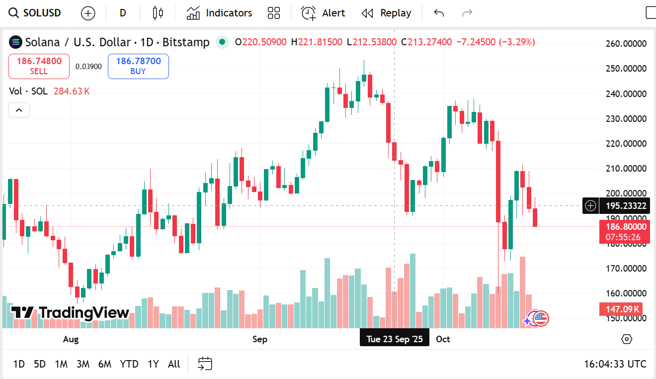 Solana is currently selling at $186.75 after losing a significant 2.86% in the last 24 hours with a $107.81 billion market cap. However, as daily volume falls 11.25% to $9.58 billion, momentum slows down marginally as traders take profits off recent advances.