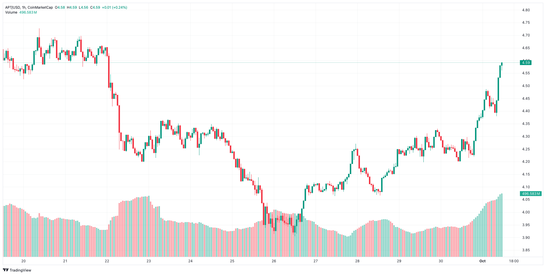 Aptos has outperformed in recent weeks, rising 5% over the past seven days compared to the crypto market’s 2%. The recent performance is due to its WLFI partnership and continued ecosystem growth.
