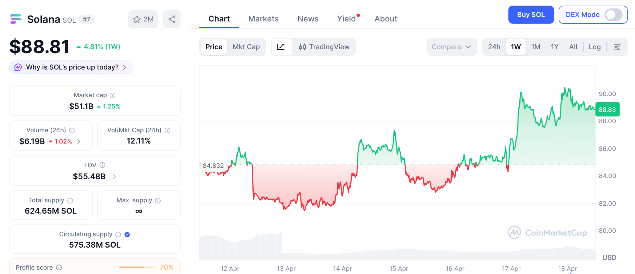 SOL trades at $88.81 on April 18 per CoinMarketCap, with ETF inflows hitting a monthly high per CoinGecko. The Alpenglow upgrade targeting sub-150ms finality is set for mid-2026, SOL ETF AUM crossed $1 billion, and Firedancer now pushes the network through 5,500 transactions per second.
