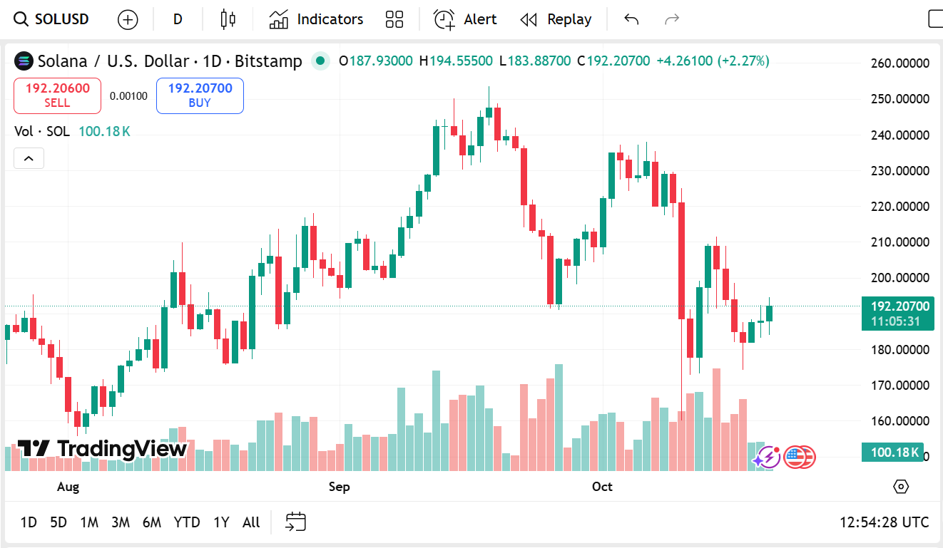 Solana stands at $192.21 today, having gained 1.52% in the last 24 hours, with a market cap of $104.85 billion and a trade volume of $5.76 billion, which rose by 45.91%. This rise reflects higher demand for SOL because network activity is rising via NFT mints, gaming projects, and decentralized apps.