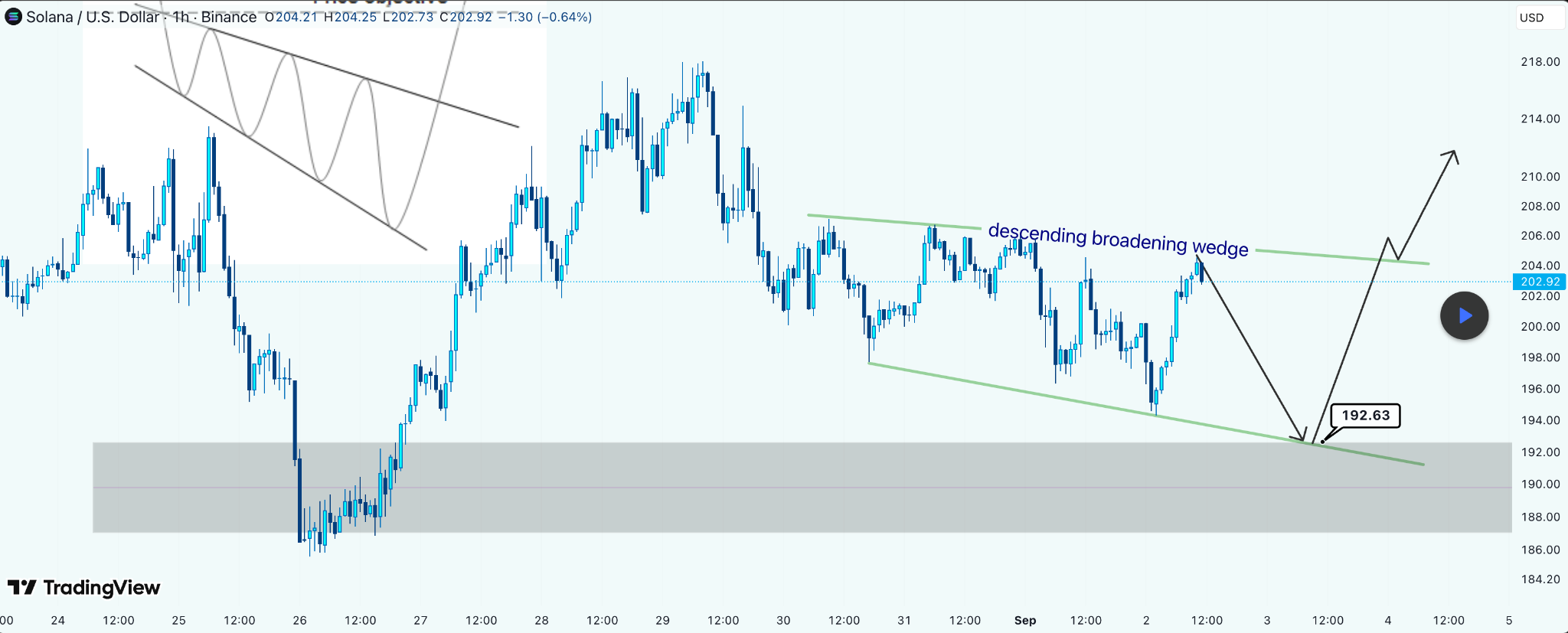 Solana pushed above $200, but traders remain cautious. The rally looks strong, but a short pullback is likely before any breakout holds. Analyst Melikatrader says the Solana price is forming a descending broadening wedge – a setup that often sparks big moves but comes with heavy volatility.