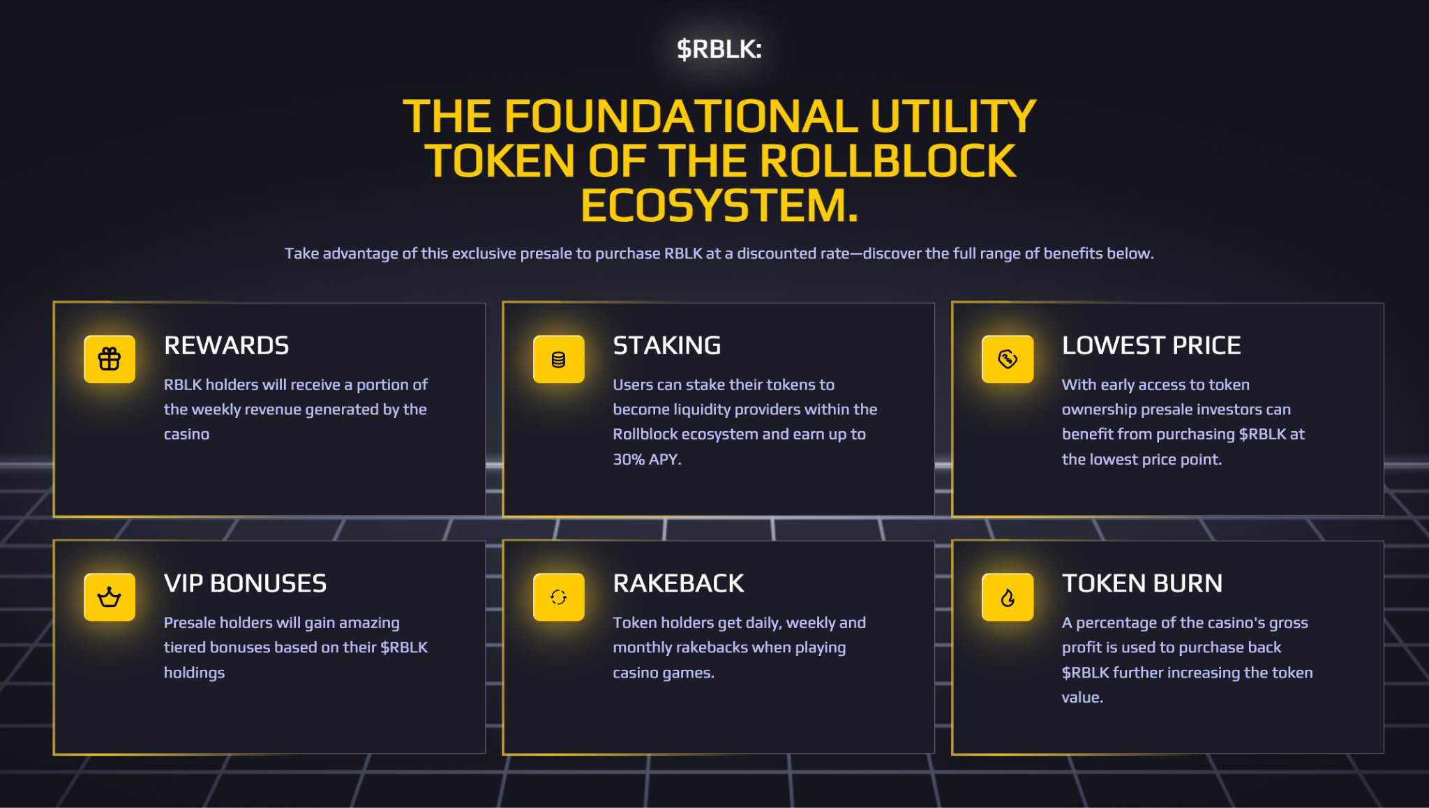 RBLK powers the platform. It handles staking, rewards, and crypto governance. What sets it apart is its deflationary income model. Up to 30% of platform revenue goes into weekly buybacks.