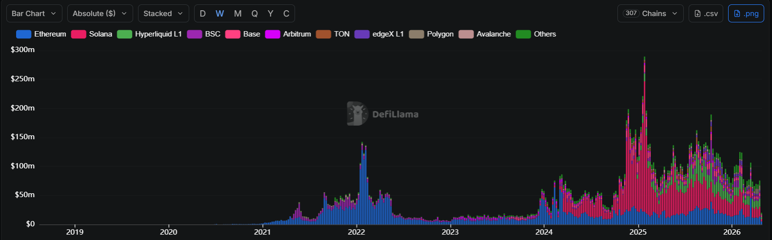 Hyperliquid L1 ranked second at $14.18 million, while Ethereum came in third at $13.55 million. Further down the list, Polygon posted $7.58 million, Base $4.28 million, BNB Chain $4.15 million, Arbitrum $1.62 million, and TON $1.37 million.