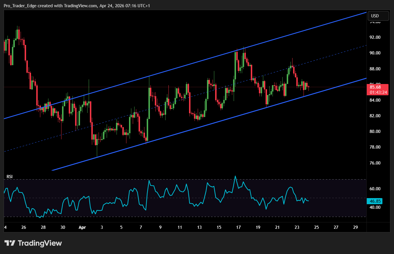 The 2-hour channel lower boundary at $83–$84 aligns with the daily 20-day EMA, making that zone the most important support area to watch going into April 24.