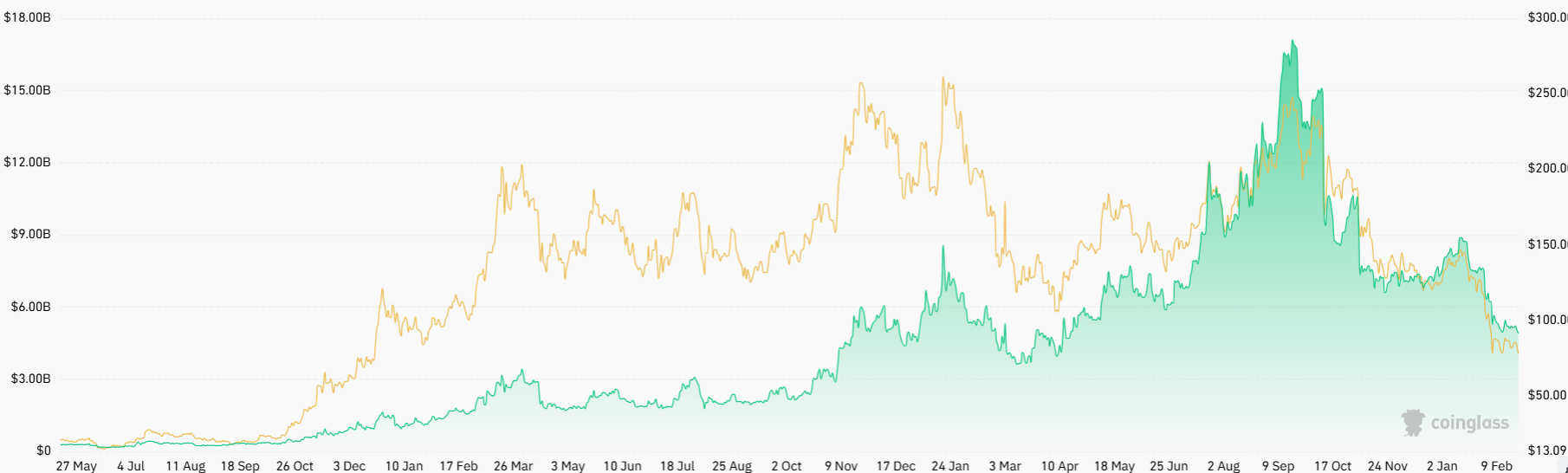 Open interest in Solana futures dropped roughly 2% to around $5.09 billion, even as trading volume climbed sharply. That combination typically signals forced liquidations rather than new buying coming in.