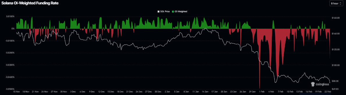 Funding rates have also flipped negative. SOL’s funding rate currently stands at -0.0245%, a level last seen around the February 6 price dip. Negative funding means short traders are paying long traders, which reflects a market leaning heavily bearish.