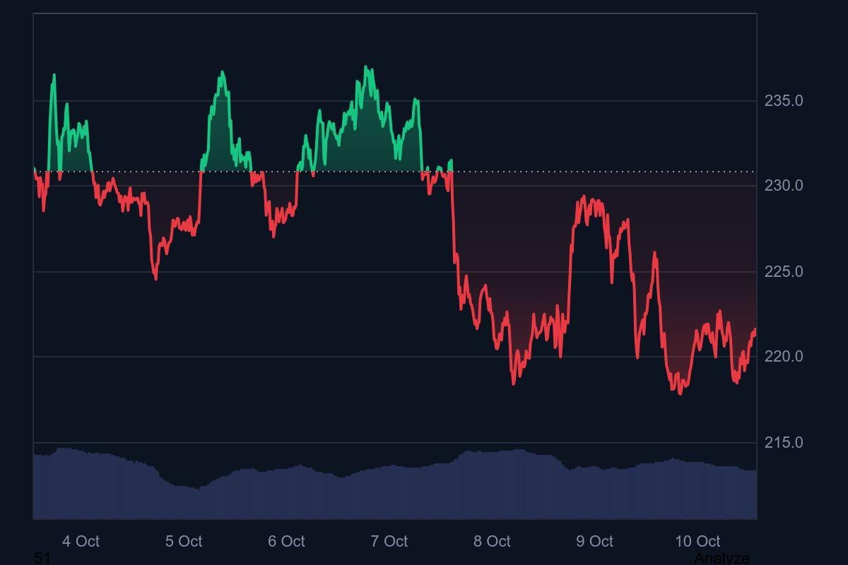 Solana dipped below $225 in the short term, with some consolidation at these levels. It has been resisting near $222 and $230 in recent days but has shown resilience. Key support levels are around $218 and $212. If the price successfully breaches $230, we can expect SOL to rise further towards $245.