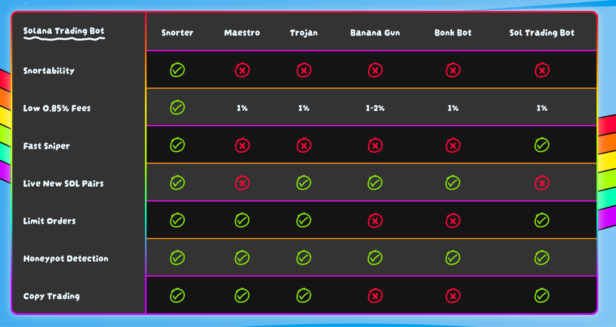 Snorter’s main goal is simple: to help users enter trades before anyone else. It achieves this by utilizing a private RPC infrastructure to circumvent the typical congestion of Solana DEXes and execute trades within milliseconds.