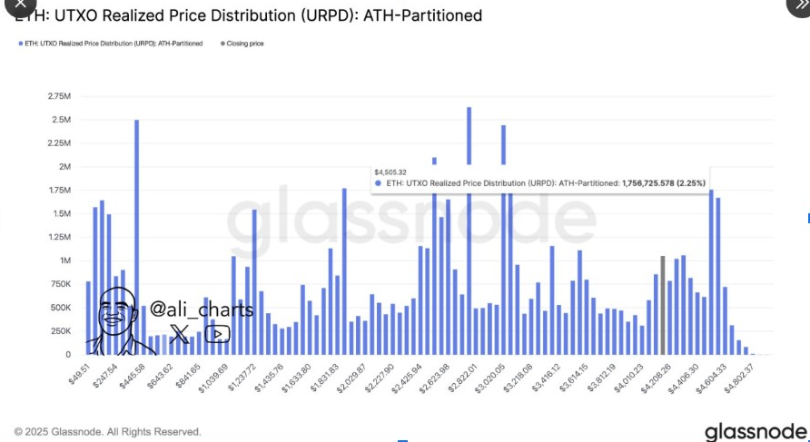 On-chain data from Glassnode identifies $4,505 as a key resistance level, where 1.75 million ETH last exchanged hands. Crossing this mark could unleash stronger demand and push ETH toward $5,353, aligning with historical cycle patterns seen in both 2017 and 2021.