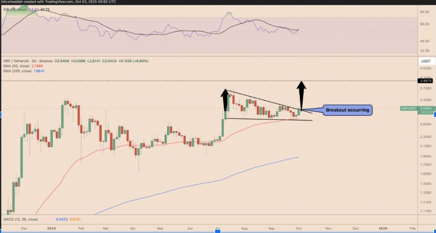 Currently, XRP holds support near its 50-day exponential moving average, which aligns with past RSI golden cross rallies. Price targets for October suggest an advance toward $3.39, with the potential to extend gains to $3.98–$4.32 if momentum holds. A descending triangle breakout also supports this view, pointing to a 30% rally.