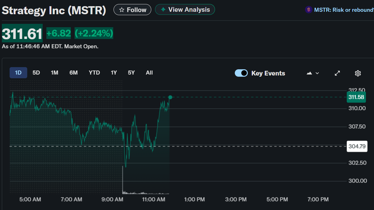 Strategy Inc. (MSTR) surged 2.24% to $311.61 by late morning, rebounding after a brief dip in early trading.