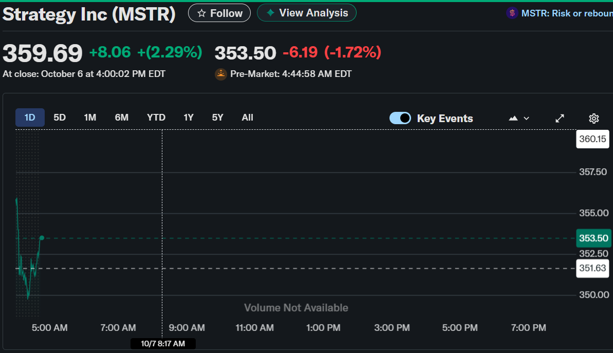 Strategy Inc. (MSTR) ended last week with a stock price of $359.69, marking a 2.29% rise on Friday. However, the pre-market session on Monday showed a decline to $353.50, reflecting a 1.72% drop.