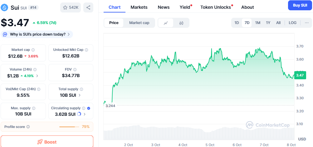 The SUI price is in an uptrend, reflecting broader market sentiment. A 6% weekly gain pushed the price above $3.4. Further, according to CoinMarketCap, the price has increased by 13% on the 90-day chart.