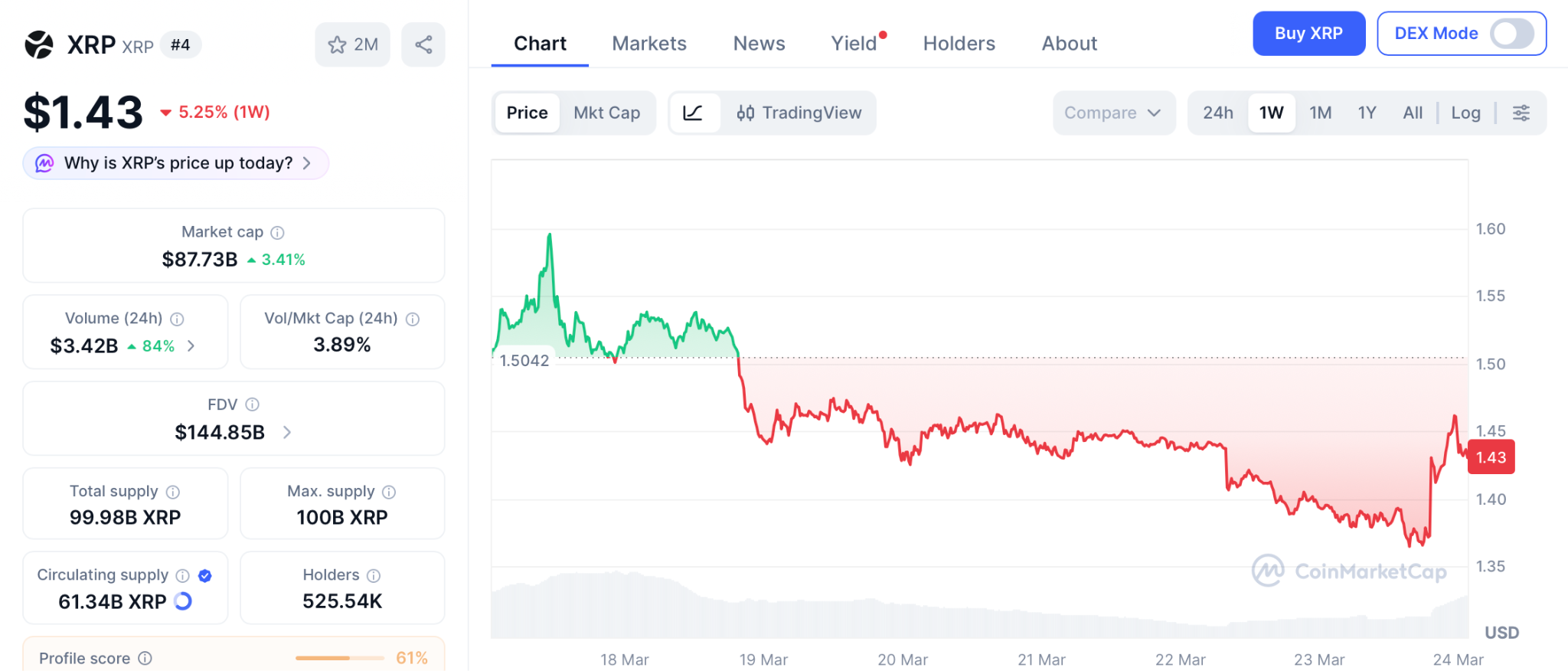 XRP trades near $1.43 as of March 23 with the SEC commodity classification and $1.44 billion in spot ETF inflows, according to CoinMarketCap.