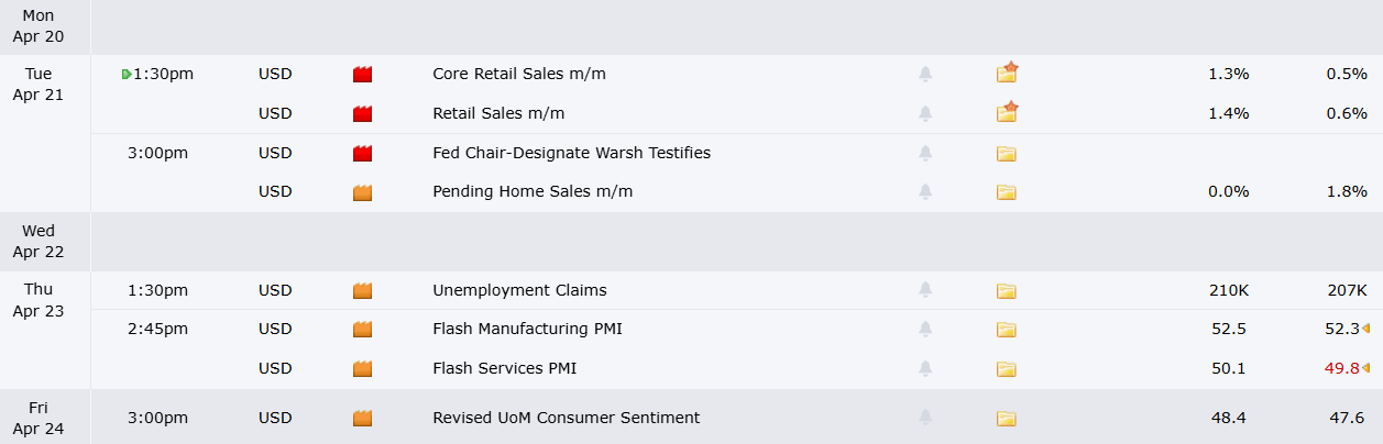 Tuesday brings March retail sales data from the Census Bureau. Economists expect a 1.3% increase. The University of Michigan consumer sentiment reading on Friday will also be closely watched. Its preliminary April reading hit a historic low of 47.6 earlier this month.