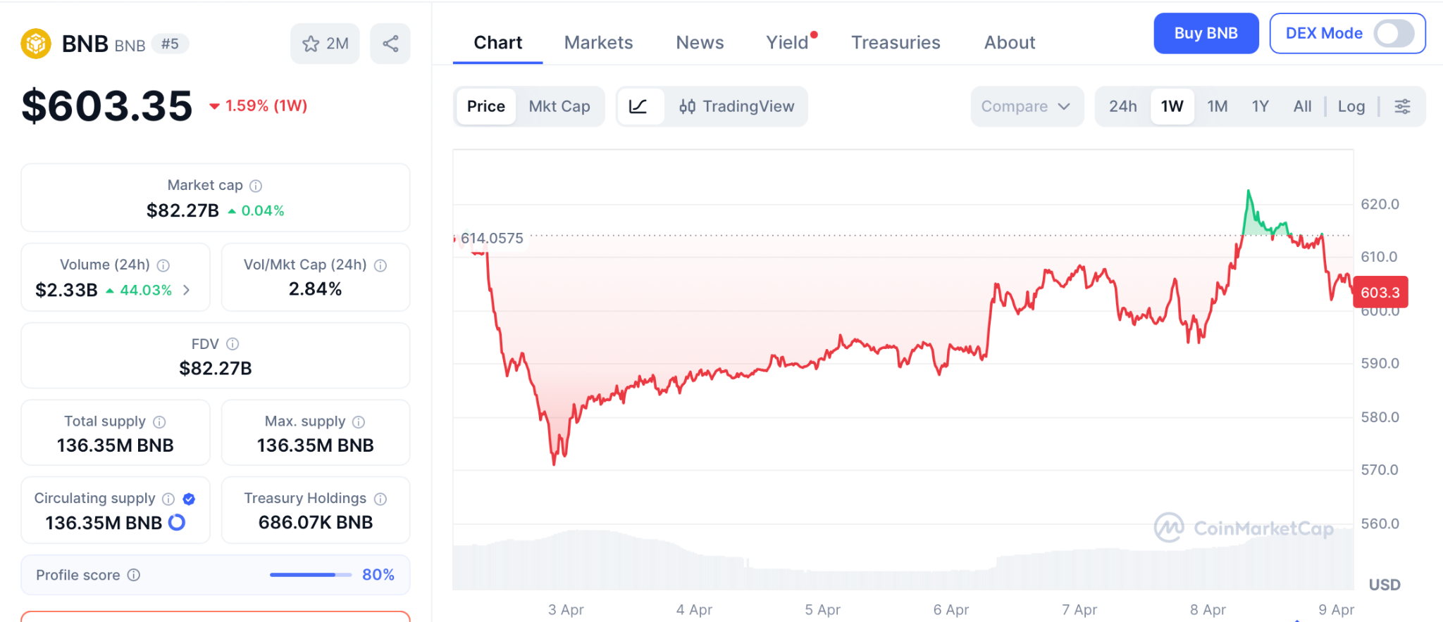 BNB jumped 3.2% to $603 on April 8 while ADA trading volume spiked 79% in a weekly rebound according to CoinMarketCap. Cardano whale wallets holding 10 million ADA or more reached 424, the highest in four months, as the Midnight privacy chain launched with Monument Bank and Google Cloud building on it.