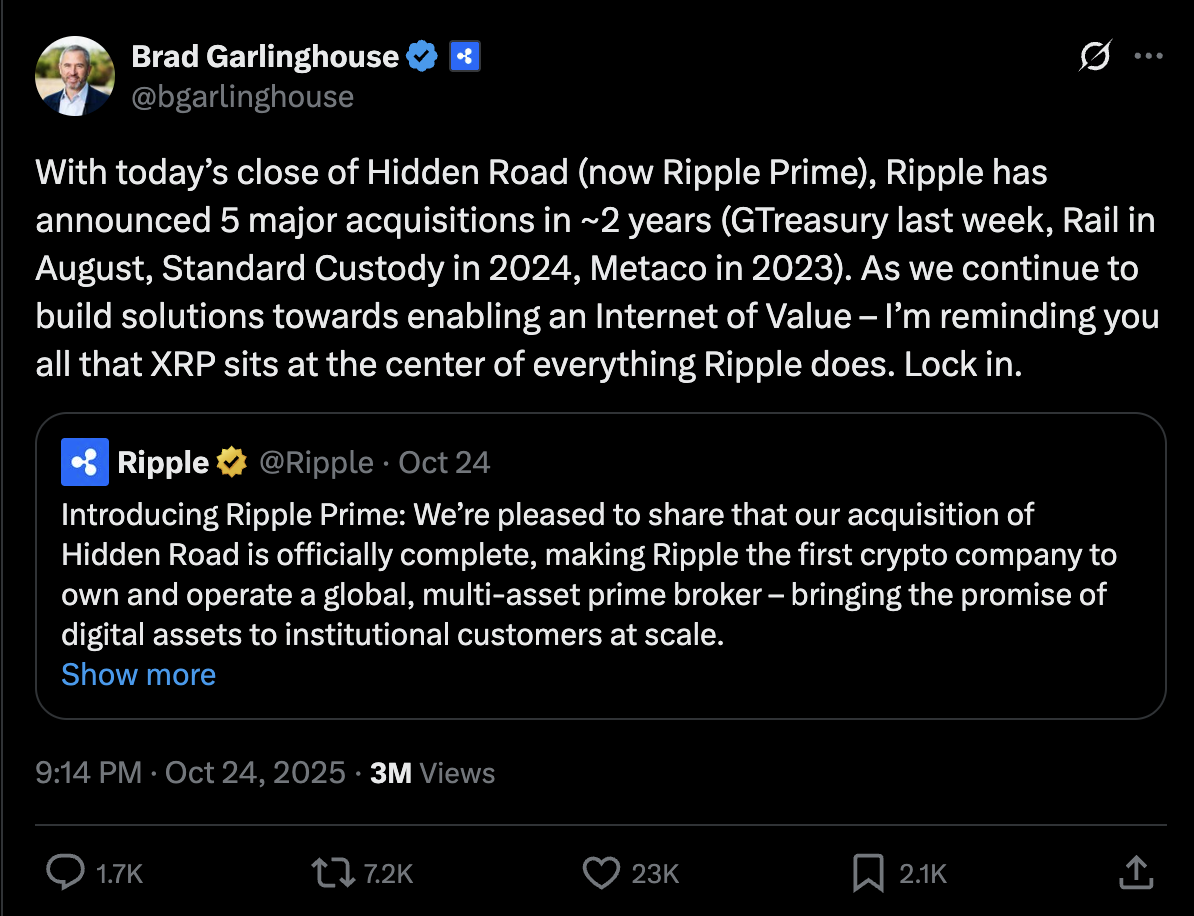 Ripple is laying serious groundwork for XRP’s long-term rise, even as the token dipped to $2.27 on November 4 following some short-term weakness. The company has spent over $4 billion in 2025 buying firms like Palisade, Hidden Road, and GTreasury.