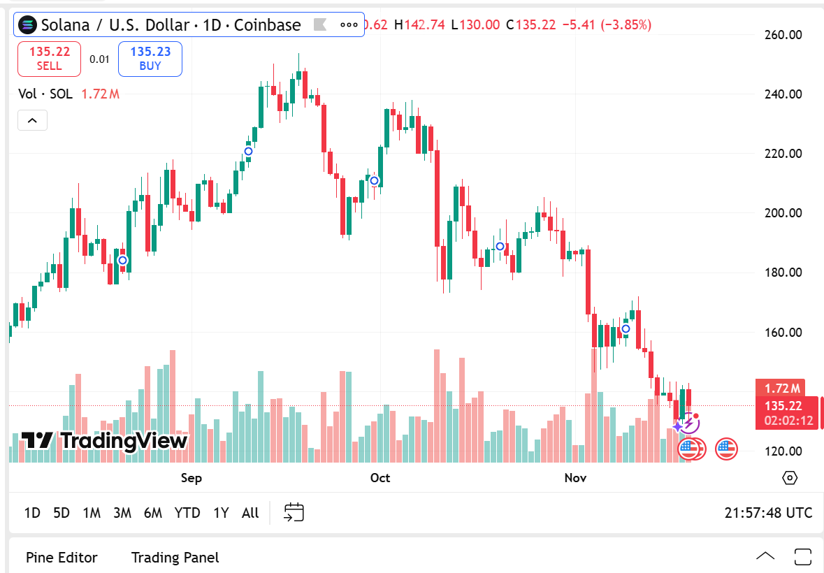 Solana is currently selling at $132.22 following a significant drop of about 5.57 percent, with a total market capitalization of $73.78 billion.