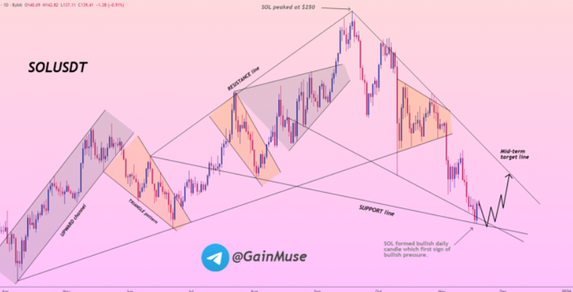 Solana recently touched the lower boundary of its descending pattern and then created a bullish daily candle, signaling early signs of stability.