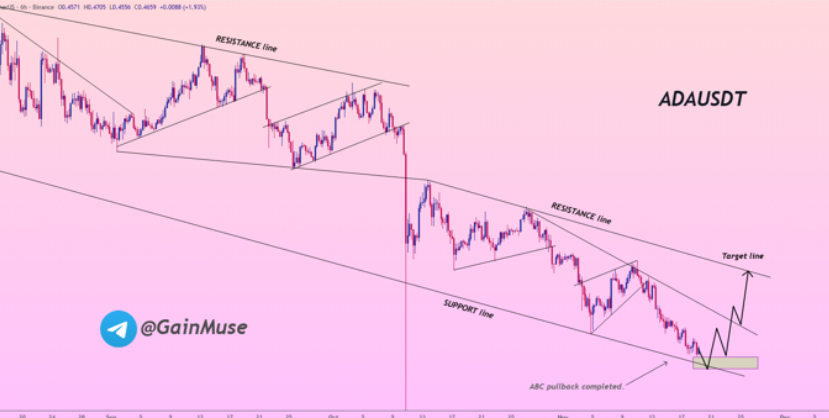ADA is approaching the final leg of an ABC corrective pattern inside a falling channel. The $0.45 region remains a key demand zone that has repeatedly absorbed sell side pressure. Cardano appeals to investors seeking longer term structural reliability rather than rapid speculative swings.