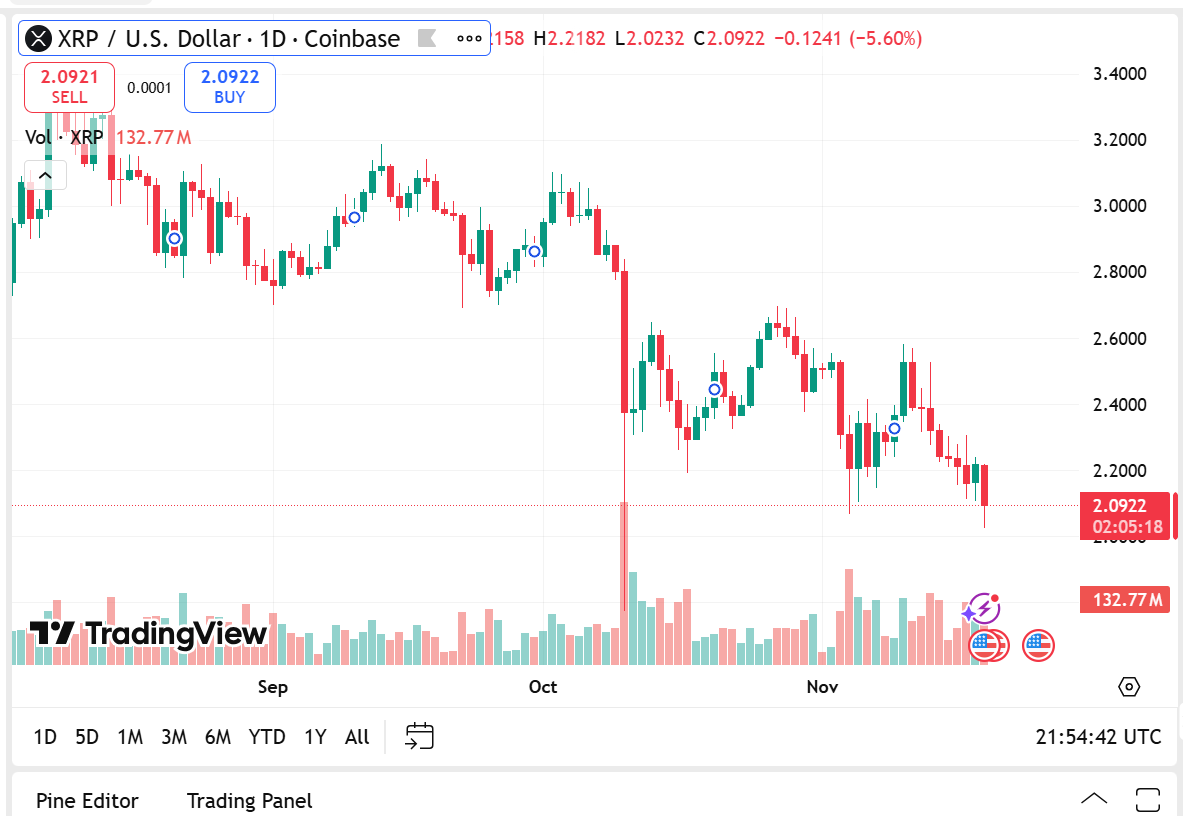 XRP remains one of the more debated assets in the market, yet it continues to carry relevance due to its established position in cross border settlement technology. Trading at $2.09 with a 6.53 percent daily decline, XRP maintains a market cap of $125.53 billion. Trading volume stands at $4.58 billion after falling 34.81 percent.