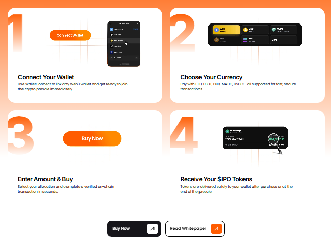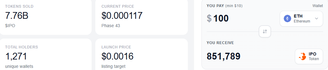 Token use: $IPO tokens let you stake, vote, and join deals. You can also earn rewards and participate in platform governance.