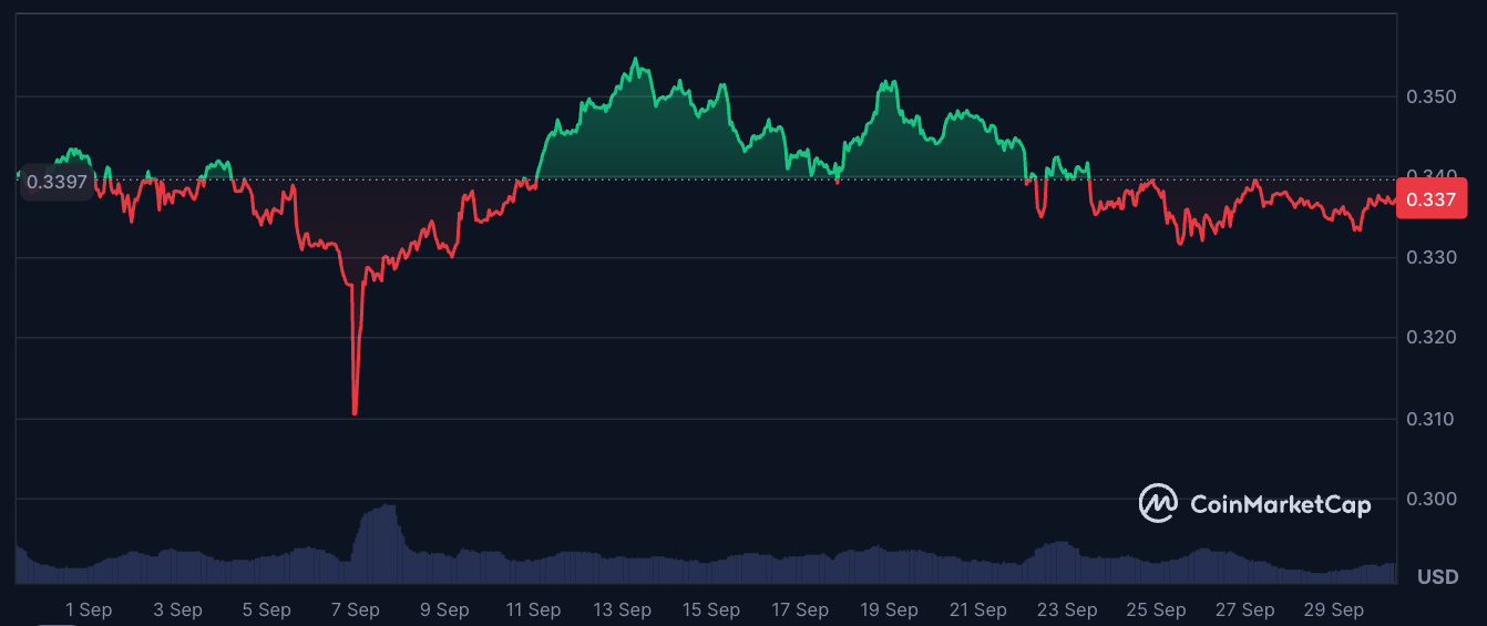TRX is the native token: you pay fees with it, stake it for rewards, or use it to power smart contracts. Currently, TRX is trading at $0.34, down from its rally in early September but still above the lows from March of this year.