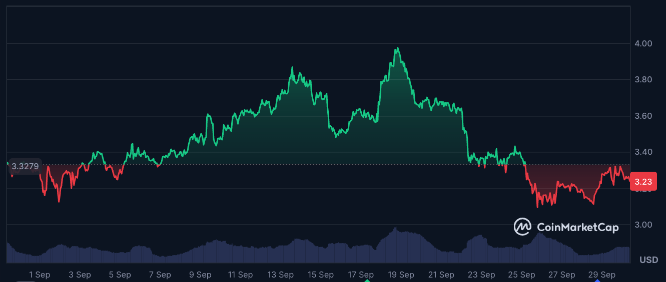 Right now, experts are pointing to three projects that could capitalize on this seasonal momentum. TRON (TRX) is trading around $0.34 after its early-September rally cooled off, while Sui (SUI) sits at $3.22, also off local highs.