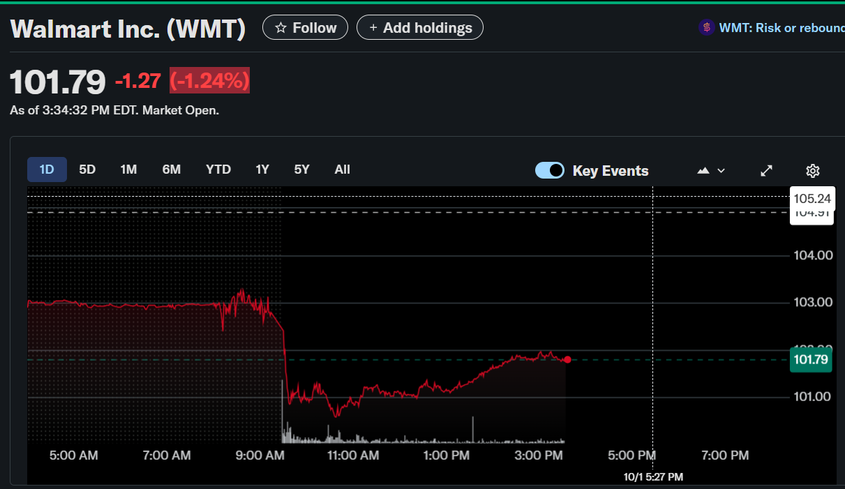 Walmart Inc. (WMT) saw its stock price fall by 1.24% on October 1st, closing at $101.79 by 3:34 PM EDT.
