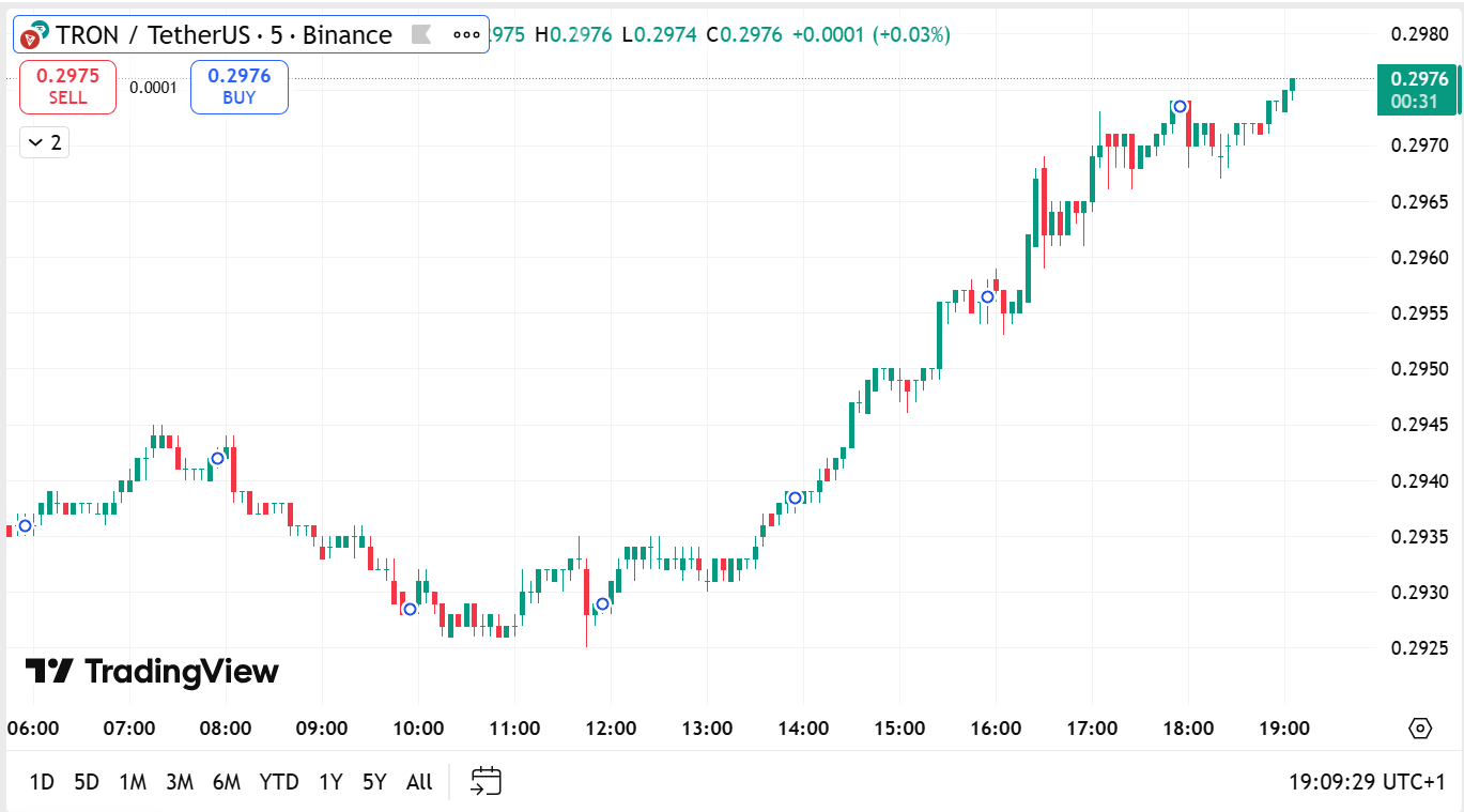 TRON remains one of the most actively used payment-focused blockchains, with its token trading at $0.2975, up 0.74% over the past 24 hours. The network’s market capitalization stands at $28.11 billion, while daily trading volume has slipped to $549.5 million, down 16.31%, suggesting reduced short-term participation.