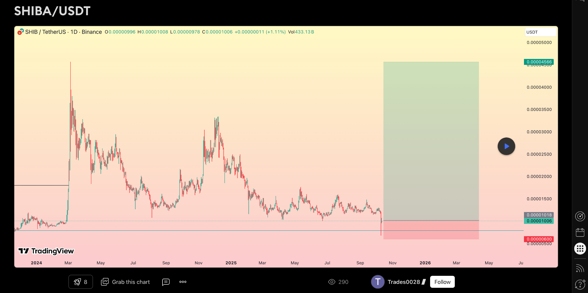 At the moment, Shiba Inu trades around $0.00001032, and traders are watching closely to see if it can break above the current resistance levels. Analysts like “Trades” on TradingView believe the coin is preparing for a strong move upward after months of accumulation. According to him, SHIB might be ready for a swing-long position as it seems to have “finished its job at the bottom.” Other market watchers agree that the coin could see a potential breakout soon, possibly hitting multi-month highs if momentum holds.
