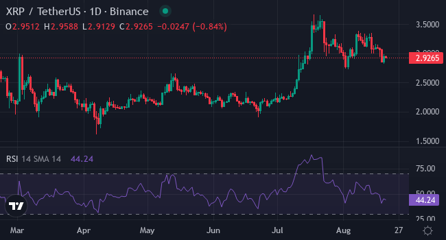 XRP slides as traders digest a rough week. The coin trades between 2.95 and 3.29 after losing 10.35% in 7 days. The month looks worse with a 17.39% dip, yet the 6-month chart still shows a 14.08% gain.