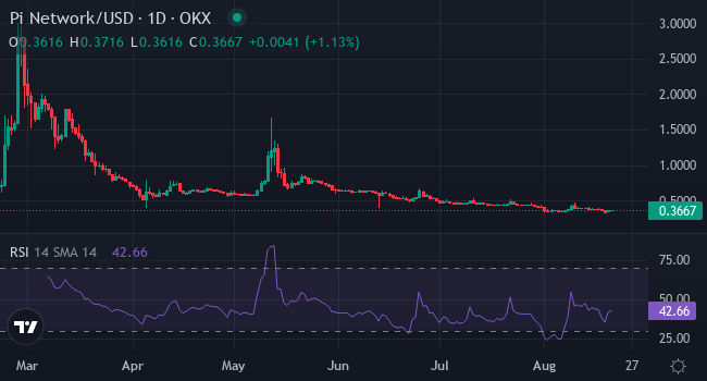 Pi Network rides a sharp slide. The coin lost 8.44% this week and 19.72% in 1 month. Zoom out 6 months and the pain is clear at minus 48.73%. Today it trades between 0.36 and 0.41, a tight band that keeps traders edgy.