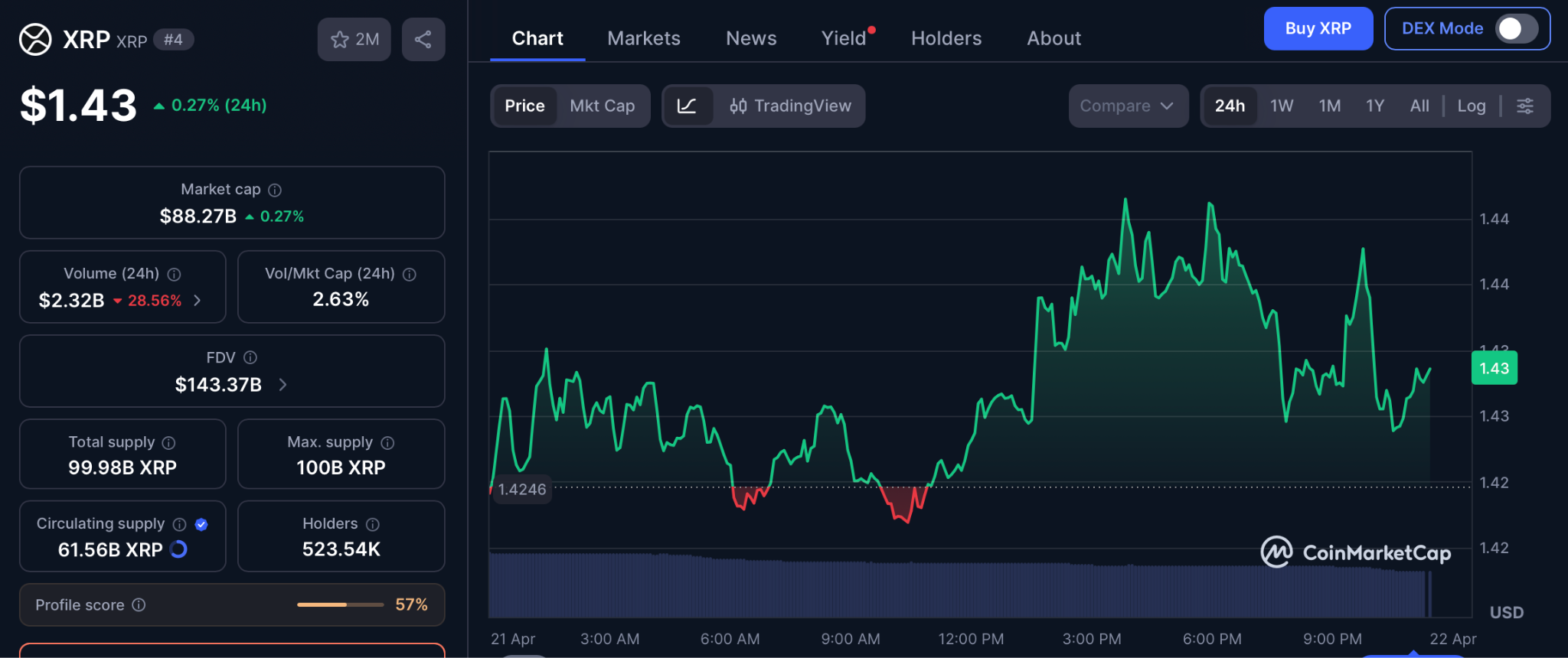 XRP (XRP) trades near $1.43 on April 21 per Yahoo Finance, a 13% weekly advance after tapping $1.50 on April 17 per AInvest. The RSI sits in the middle of its range with daily volume steady, and XRP reclaimed the 50-day EMA near $1.38 this week, the first such close of the quarter.