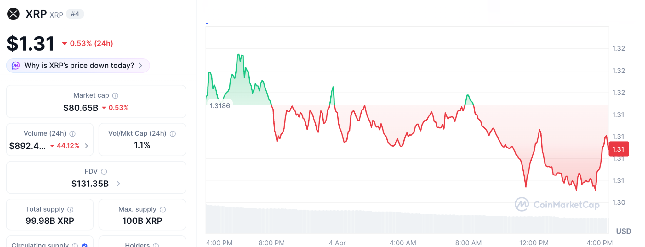 The specific mechanics of a $592 million XRP exchange withdrawal creating a rotation signal are visible to on-chain analysts and invisible to anyone watching the $1.32 price in isolation. Large whale wallets holding between 100 million and 1 billion XRP added roughly 200 million tokens in early March creating the accumulation base before the March 27 and March 30 withdrawal events moved $592 million off Binance and Coinbase simultaneously. BeInCrypto confirmed XRP trades at $1.32 on April 3 down 2.9% over the past seven days still trapped inside a descending parallel channel with the whale movement happening alongside the price deterioration not against it.