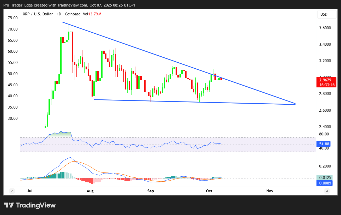XRP builds an ascending triangle structure between $2.60 support and $3.25 resistance. Volume analysis shows consistent accumulation above $2.80.