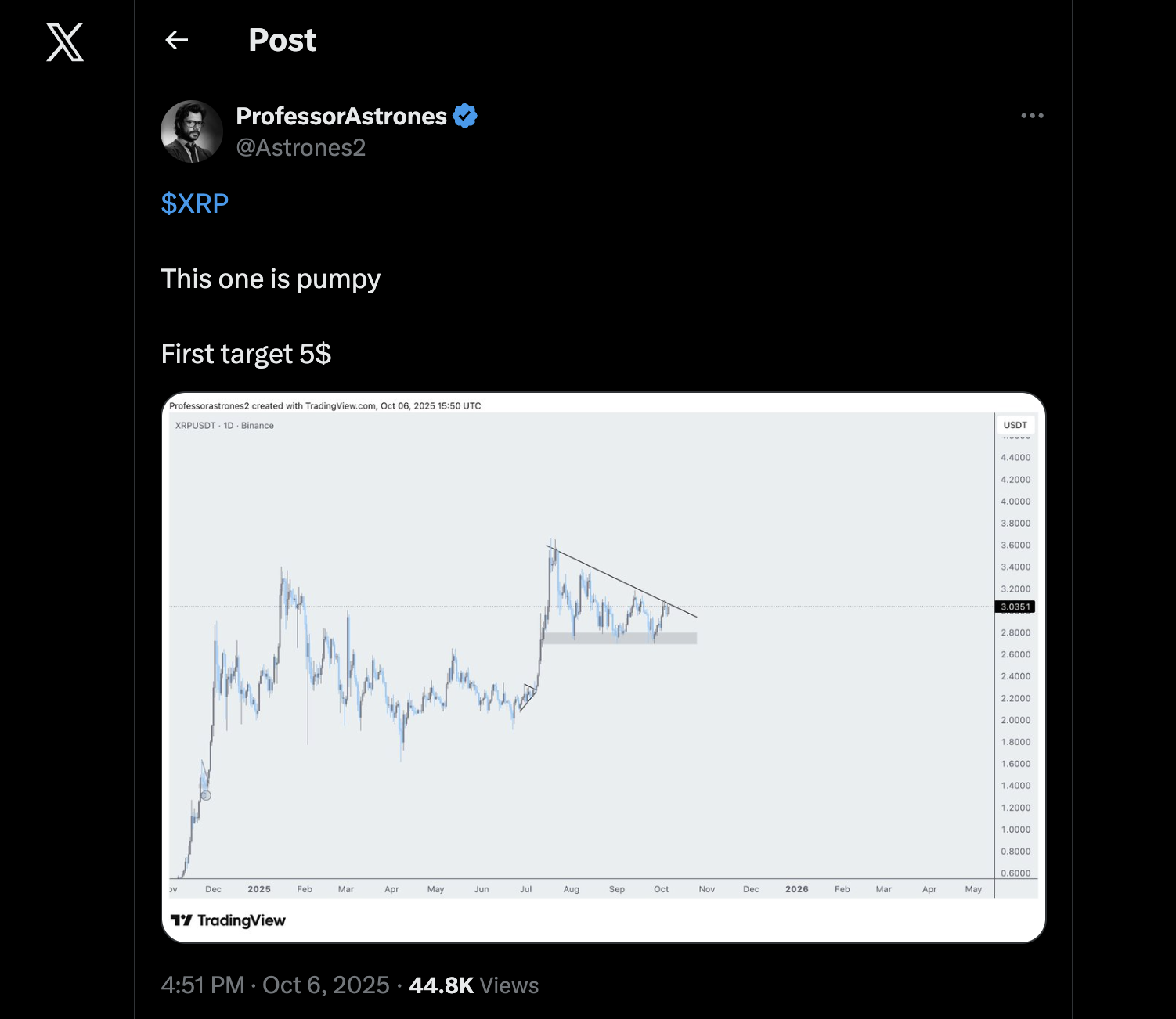 Professor Astrones, a well-known market analyst, recently called XRP’s setup “pumpy”. He believes XRP could soon break above its tightening range and push toward $5. Currently trading around $2.97, the coin has held firm between $2.60 and $3.00 for weeks, showing steady buying activity.