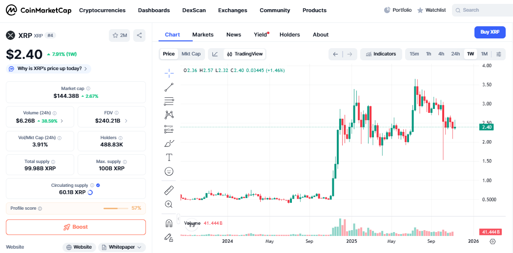 On Nov 13, XRP trades around $2.4. Market cap sits in the $144 range, with daily trading volume around $5.5 to $5.9 billion. XRP hit a fresh all-time high near $3.65 in July 2025, so today it is still roughly 30% under that level.
