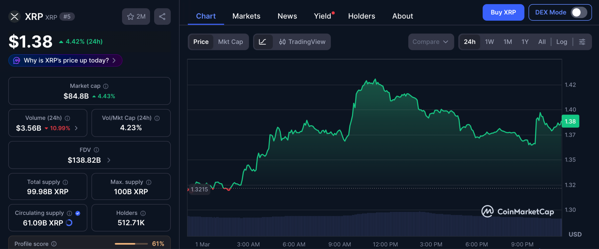 XRP trades near $1.39 after holding steady while the broader market dropped according to coinmarketcap.